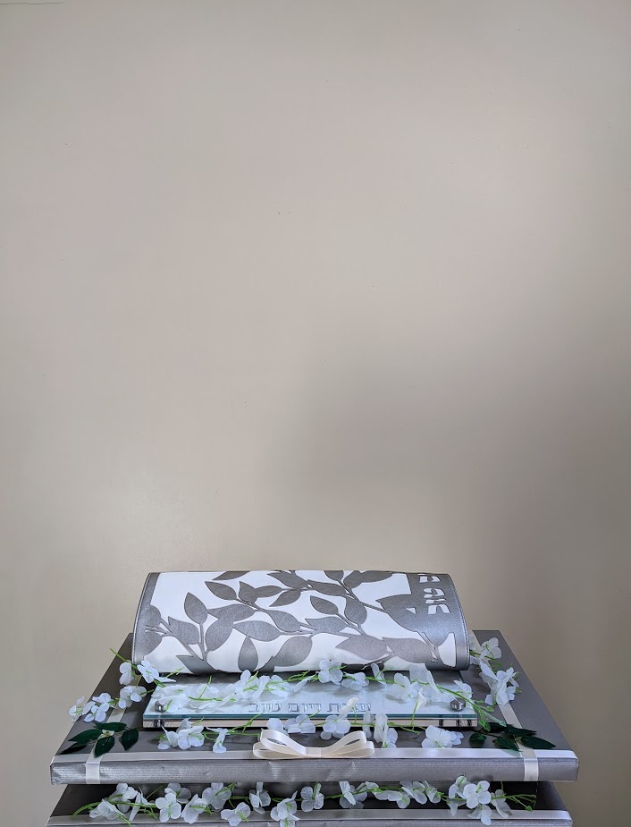 This gift includes a Leatherite Gilded Radiance Challah Board from the Feldart Range.A stunning leather & Glass Challah board, elegantly crafted with luxurious an embroidered leather design. , presented with a gorgeous Leaf Laser Cut Challah Cover.