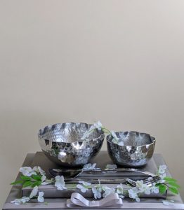 These stunning large and small Hammered bowls with a fluted design are sure to add a touch of glamour to any dining table , beautifully presented with Hammered design Salad Servers.