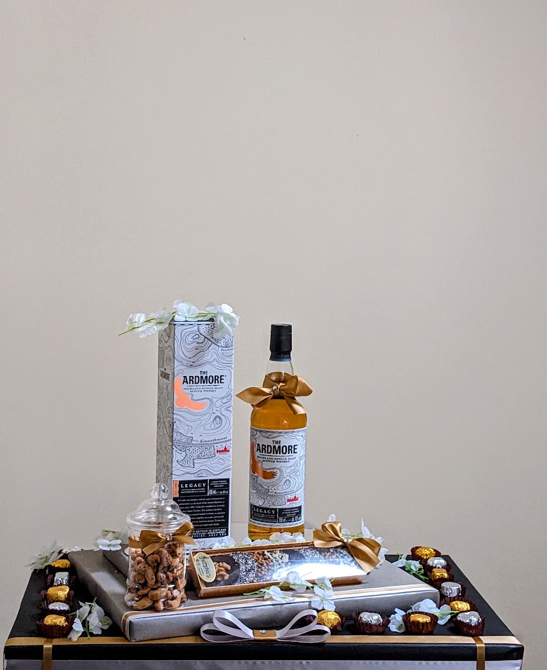 Mishloach Monos includes The Ardmore Single Scotch Whiskey, assortment of Symphony Chocolate Discs and Chocolates and a jar of Cashew Nuts.