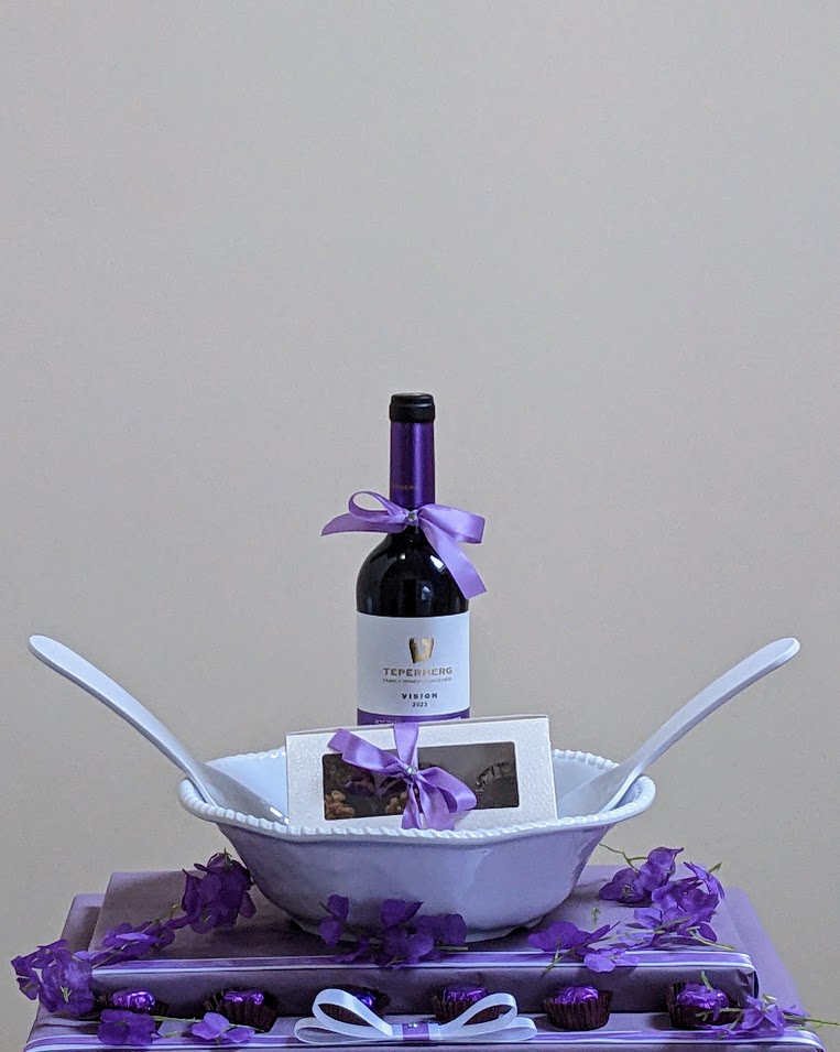 Mishloach Monos includes a Melamine Salad Bowl and Servers, a Bottle of Teperberg Cabernet Sauvignon Dry Red Wine, and an assortment of Symphony Chocolate Discs and Symphony Chocolates.