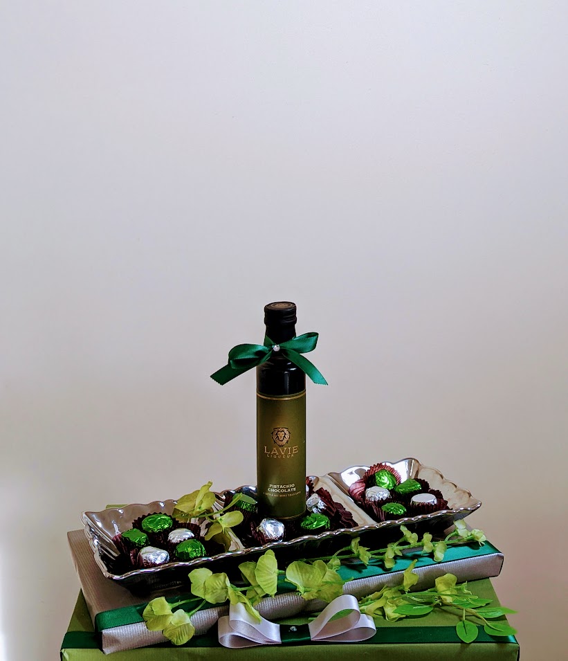 Mishloach Monos includes a bottle of Lavie Pistachio Liqueur (250ml) and a Porcelain Silver Compartment Dish with an assortment of Symphony Chocolates.
